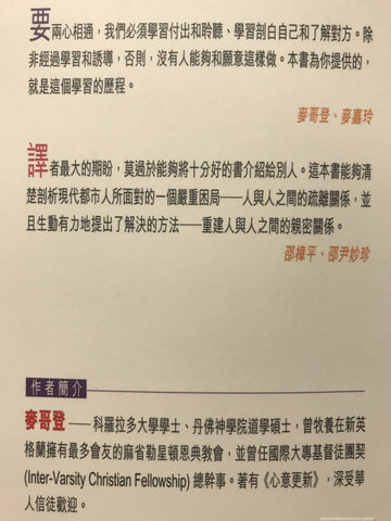 要兩心相通,我們必須學習付出和聆聽、學習剖白自己和了解對方。除非經過學習和誘導,否則,沒有人能夠和願意這樣做。本書為你提供的,就是這個學習歷程。